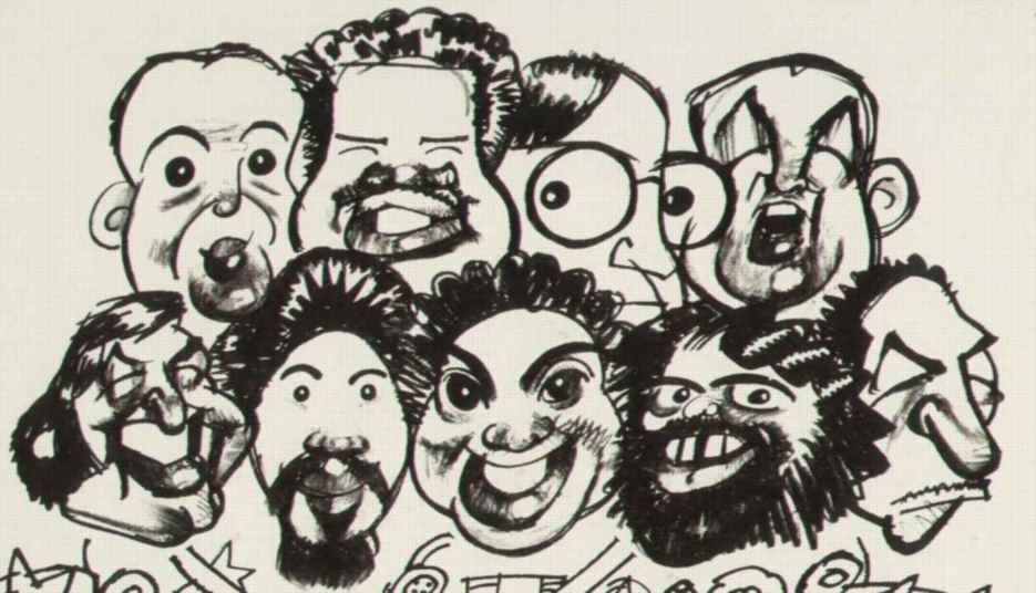 En la fila superior y de izq. a der.: Al Santiago, Kako, Barry Rogers, Dioris Valladares. Segunda fila y en el mismo orden: yayo "El Indio", Johnny Pacheco, Cheo Feliciano, Charlie Palmieri y Chombo Silva Arte y diseño de Sandy Hoffman Cortesía de David Cantrell
