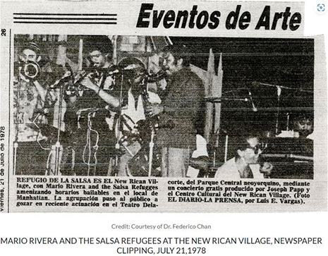 Corte del periódico The New Rican Village, con fecha de 21 de julio de 1978. El cual demuestra la orquesta de Mario Rivera y Los Refugiados de la Salsa.